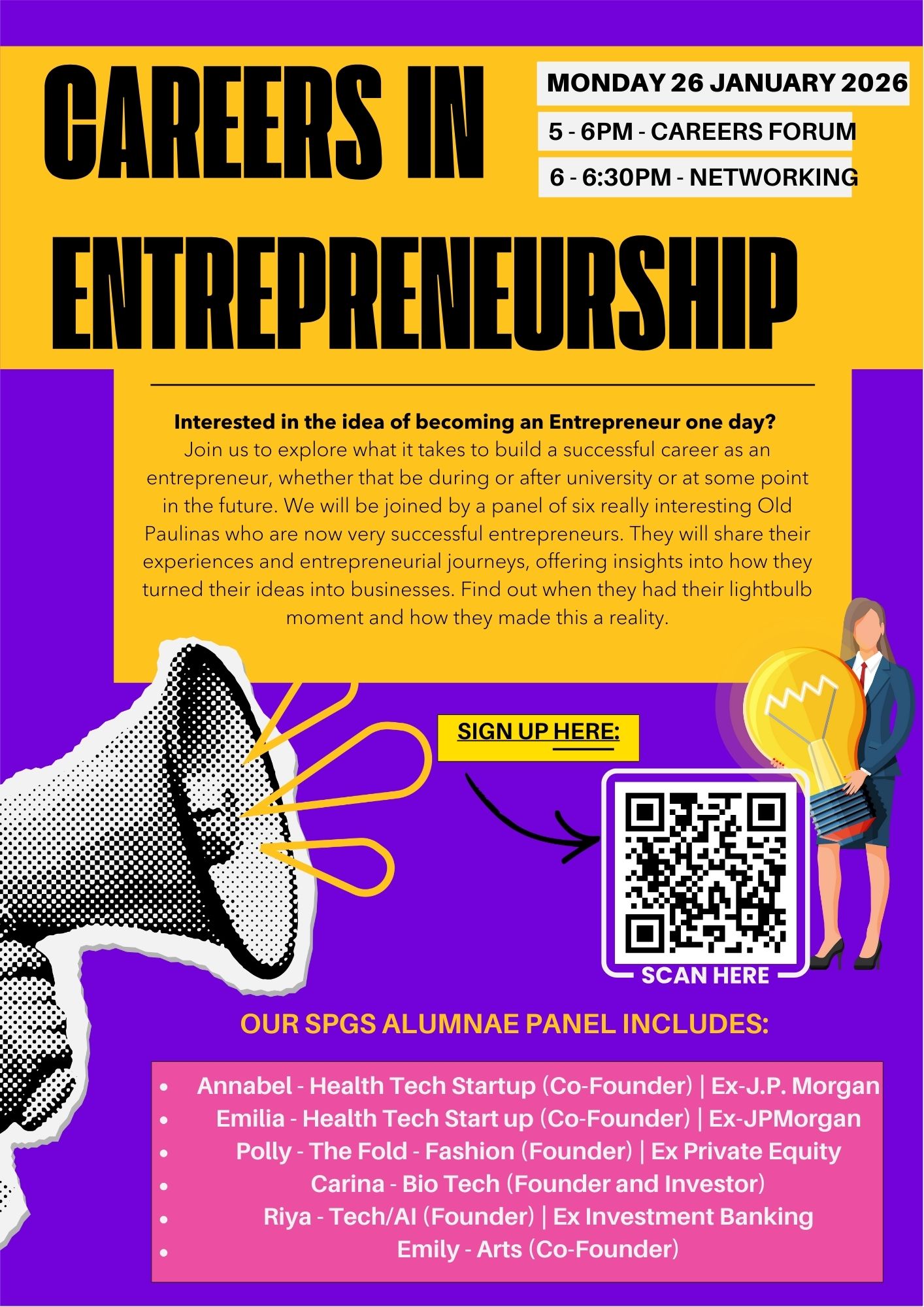 We are excited to be hosting a panel of Old Paulina entrepreneurs from a range of industries, including health tech, fashion, tech/AI and the arts. Some of our speakers previously worked in investment banking and private equity, including roles at firms such as JP Morgan, before becoming an entrepreneur.